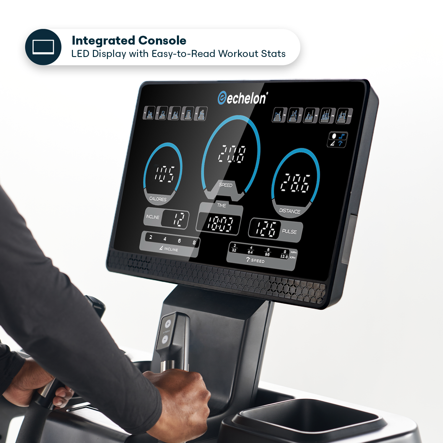Introducing the Echelon Stride-50-RCX, a feature-packed treadmill that brings the gym to your doorstep. Powered by a quiet 3.0 Peak DC motor, it offers a smooth workout experience with speeds up to 12.5 MPH and a 15% incline. Track your progress on the LED display, enjoy Bluetooth® connectivity for earbuds, and keep devices charged with integrated wireless and USB ports. The 22” x 57” cushioned running deck ensures a comfortable, low-impact workout, while the fold-up design and wheels make storage and portability effortless. Upgrade your fitness routine and achieve your goals with ease!